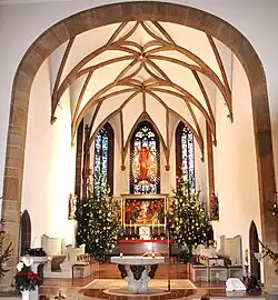 Den Chor kennzeichnet ein dreijochiges Netzgewölbe, das sich in Achteckseiten erstreckt.