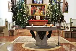 Sowohl Zelebrationsaltar, Altarkreuz als auch Ambo wurden von Bildhauer Ulrich Langohr aus Menden gefertigt.[11]
