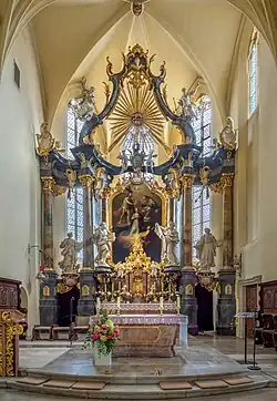 Der Altar, der den Chor ausfüllt, besitzt einen sechssäuligen Aufbau, der an einen Baldachin erinnert. Im Zentrum steht das Altarbild mit dem Motiv der Krönung Mariens. Es wurde wohl vom Würzburger Hofmaler Johann Christoph Fesel geschaffen. Eine Inschrift, die oberhalb des mit Rankwerk verzierten und vergoldeten Rahmens angebracht wurde, verweist ebenfalls auf das Motiv. Sie lautet: Veni Coronaberis (dt. „Komm, du sollst gekrönt werden“). Der Auszug besteht aus einem plastischen Lamm auf dem Buch im Strahlenkranz. Neben den überall erkennbaren Engelsfiguren wurden die vier Evangelisten um das Blatt postiert.