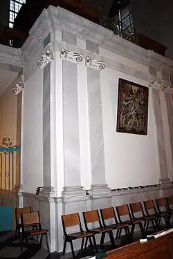 Die Kirche besaß ehemals zwei barocke Beichtstühle, die mit gediegenen Schnitzereien versehen waren. Sie waren wahrscheinlich ebenfalls Arbeiten Helmonts, wie die in der Holzverkleidung der Kapellenwände. In schmückenden Medaillons, die überwiegend Figuren oder Szenen der Heilsgeschichte darstellten, war auch das Wappen des Stifters eingearbeitet. Es handelte sich um Max Heinrich von Geyr, einen Domherren in Köln.[20] Der heutige Beichtstuhl gehörte zum Inventar der im Krieg zerstörten Kirche St. Kolumba.[19]