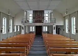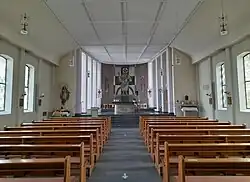 Der Haupteingang im Norden führt in das Kirchenschiff, welches durch einen breiten, nach Südosten auf den Altarraum zustrebenden Mittelgang in zwei Bankblöcke gegliedert wird. Licht gelangt über schmale Segmentbogenfenster mit gelb-grautoniger Sprossenverglasung in den Kirchenraum; im Schiff sind die Fenster durch eine motivische Bleiverglasung zusätzlich ausgeschmückt. Der ausgeschiedene Altarraum läuft in einem eingezogenen Halbkreis aus. Er liegt um fünf Stufen bis zum Altarblock bzw. sieben Stufen bis zur Stirnwand erhöht und sticht durch seine braun-grautonige, figurative Wandmalerei hervor.[1]