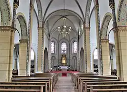 Das Kirchengebäude wurde im Stil der Neuromanik errichtet. Bei der architektonischen Grundform des Kirchengebäudes handelt es sich um eine Basilika, mit kreuzförmigem Grundriss. Das Langhaus, unterteilt in ein Mittelschiff und zwei Seitenschiffe ist gegliedert in drei Joche. An das Langhaus schließt sich ein Querhaus an, daran der Chor.