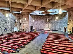 Der Hochaltar von Blasius Gerg ist aus einem Muschelkalkblock herausgearbeitet und mit einem Tiefenrelief verziert, das Christus im Symbol des Osterlamms darstellt. Über dem Altar hängt ein spätgotisches Holzkruzifix (um 1520) eines fränkischen Meisters in neuer Fassung. Die Chorwand schmückt ein 14 Quadratmeter großer Wandteppich mit Szenen aus dem Leben Mariens. Ein vergoldeter Tabernakel ist mit ungeschliffenem Bergkristall und grünem Diabas in Kreuzform verziert, ein symbolischer Hinweis auf den verklärten Christus. Blasius Gerg gestaltete auch einen Doppelengel an der Nordwand der Kirche. Auf der Innenseite hält er einen Fisch, auf der Außenseite der Kirche Ähren in seinen Händen. Ebenfalls von ihm stammt Ambo aus Eisenguss, der den predigenden Christus zeigt.