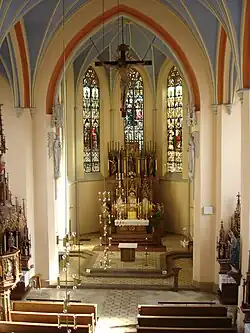 Rechts neben dem Altarraum befindet sich eine Taufkapelle mit Taufbecken und Altar, links die Sakristei. Die Kanzel erhebt sich vor einem Säulenvorsprung an der linken Bankseite, zugänglich über einen Treppenaufgang in der Nähe der Sakristeitür. Die Chorfenster zeigen Darstellungen der Apostel Petrus und Paulus sowie der Bistumspatrone, des Kaiserpaars Heinrich und Kunigunde.