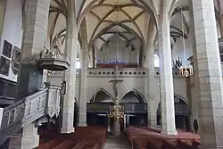 Die Kanzel von 1566 ist ein Werk von Andreas Dreßler mit typologisch gegenüber gestellten Szenen aus dem Alten und Neuen Testament. Das Chorgestühl an der Nordwand des Chores stammt von 1560. Ein Lesepult im Chor wurde 1640 geschaffen und zeigt ein als Buchauflage gestaltetes Kapitell auf einer gewundenen hölzernen Säule.