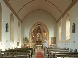 Das Innere des Kirchenschiffs ist mit einem spitzbogigen Tonnengewölbe überwölbt. Im Chor befindet sich ein Kreuzrippengewölbe. Die Ausstattung wird als eher zurückhaltend beschrieben.[6] Bemerkenswert ist ein in spätgotischer Formensprache ausgeführtes aufwendiges Retabel des Hauptaltars aus der Bauzeit der Kirche, es zeigt die Evangelisten Matthäus, Markus, Lukas und Johannes. Im Chor befinden sich drei figürlich gestaltete farbige Glasfenster. Sie zeigen in der Mitte die Muttergottes im Strahlenkranz, links und rechts davon Simon Petrus und Paulus von Tarsus. Das Kirchengestühl lässt einen Mittelgang frei und bietet 114 Sitzplätze. Unter der Orgelempore befinden sich eine Herz-Jesu-Statue, eine Kopie des Gnadenbildes Unserer Lieben Frau von der immerwährenden Hilfe, ein Beichtstuhl und eine Gedenktafel für die Gefallenen der beiden Weltkriege. Zur Innenausstattung der Kirche gehören ferner Statuen der heiligen Antonius von Padua, Elisabeth von Thüringen und Josef von Nazaret, ein Taufbecken sowie 14 kleine Kreuzwegstationen. Der Wandteppich stammt aus neuerer Zeit. Im Vorraum der Kirche befindet sich ein Missionskreuz, das an die Volksmissionen von 1908 bis 1964 erinnert.