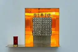 Das aus dem Jahre 1967 stammende und von dem Goldschmiede-Atelier Schwerdt+Förster entworfene Tabernakel[3] der Vorgängerkirche wurde wieder übernommen und fand seinen Platz in einer Wandnische nahe beim Altar.