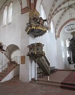 Die hölzerne Kanzel wurde 1737 von Friedrich Ziegler geschaffen und besitzt einen polygonalen Korb mit geschweifter Brüstung mit einem Gemälde der Verkündigung; der Schalldeckel ist mit Putten geschmückt, während der Kanzelfuß und der Aufgang erneuert wurden.