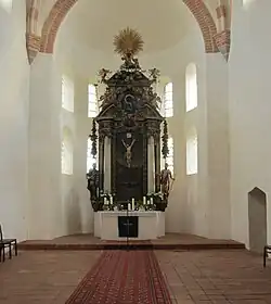 Hauptstück der Ausstattung ist ein schlank proportionierter, hölzerner Altaraufsatz aus den Jahren 1730/40, der aus einem Säulenaufbau mit seitlichen Blütengehängen gebildet ist. Dazwischen ist ein geschnitzter Kruzifixus vor einer gemalten Golgatalandschaft dargestellt, der von Freifiguren von Moses und Johannes dem Täufer begleitet wird. Im Aufsatz ist in reicher Schnitzarbeit die Eherne Schlange zwischen Putten mit den Leidenswerkzeugen gezeigt; darüber ist Gottvater mit Trinitätsglorie und Posaunenengeln dargestellt.
