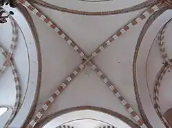 In den Seitenschiffen hat jeweils das östlichste Joch ein Kreuzgratgewölbe, die übrigen haben Kreuzrippengewölbe mit schlichten aber zarten Bandrippen, bestehend aus längs eingebauten gewöhnlichen Backsteinen, wie im Nordseitenschiff zu erkennen. Kreuzgratgewölbe in den Seitenschiffen sind in der frühen Zisterziensergotik nicht ungewöhnlich.[5] Chor, Querhaus, Vierung und das östliche Mittelschiffsjoch des Langhauses waren zunächst flach gedeckt, wurden dann aber zusammen mit den westlichen Langhausjochen mit Kreuzrippengewölben versehen. Daher sind die Rippenprofile alle gleich, mittels paarigen Rundstäben verfeinerte Bandrippen, wie es sie ähnlich auch in der französischen Gotik gibt. Zum Rippenprofil der Treuenbrietzener Nikolaikirche gibt es einen geringen Unterschied. In den nachträglich eingewölbten Teilen beginnen die Rippen auf kleinen Konsolen in Form Türkischer Dreiecke. In den westlichen Langhausjochen werden die Rippen an den Kreuzpfeilern von Rundstabvorlagen gestützt, die in Kapitellen enden.