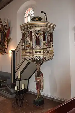 Die bemalte Holzkanzel im Renaissancestil stammt von Hans Zimmermann von Lichtenfels (Franken) aus dem Jahr 1619. Mose als Kanzelträger weist auf das dritte Gebot hin: „Du sollst den Feiertag heiligen“. Der polygonale Kanzelkorb stellt in der Mitte Jesus Christus, den Weltenherrscher, dar, der von den vier Evangelisten gerahmt wird.