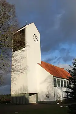 Die Saalkirche wurde 1960 erbaut, nachdem die alte Kirche wegen Baufälligkeit abgebrochen werden musste. Im Westen des mit einem Satteldach bedeckten Langhauses ist der querrechteckige, mit einem Satteldach bedeckte Kirchturm leicht eingestellt, dessen oberstes Geschoss an den schmalen Seiten die Zifferblätter der Turmuhr enthält und an den breiten Seiten die Klangarkaden, hinter denen sich der Glockenstuhl befindet.