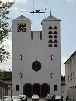 Von 1962 bis 1964 wurde die weiß verputzte Kirche mit zwei Seitenschiffen sowie der Josefs- und der Taufkapelle ausgebaut und erhielt zwei Seiteneingänge. Ihre Baumaße erreichen damit eine Länge von 48 Metern bei einer Breite von 29 Metern. Die beiden ostseitigen Türme wurden um sechs Meter auf vierzig Meter erhöht, dazu erhielt der Nordturm zwei neue Glocken von Karl Czudnochowsky. Weiter erfolgte der Einbau bleiverglaster Fenster sowie die Anbringung eines Apsisgemäldes.[5]