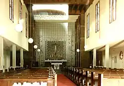 Der Altarraum, mit Klinkern verblendet, wird von einem großen Mosaik beherrscht, das von dem Künstler Charles Crodel stammt und neben einem mittelalterlichen hölzernen Kruzifix jugendstilartig Szenen der Auferstehung darstellt. Diese Altargestaltung entstand nach dem Zweiten Weltkrieg. Ursprünglich befand sich an der Altarwand ein raumhohes Kreuz aus Ziegelsteinen mit einer vier Meter hohen, aus einem Eichenholzstamm geschnitzten Christusfigur des Bildhauers Hans Perathoner. Bei seiner Enthüllung löste es wegen seiner expressionistischen Formensprache eine Kontroverse aus. Gegen den Widerstand des Gemeindepfarrers Alois Schölzel ordnete der Berliner Bischof Schreiber an, es zu entfernen. Es wurde eingelagert und hängt nach einer Zwischenstation in der evangelischen Hoffnungskirche (Berlin-Pankow) seit 2000 in der Kirche von der Verklärung des Herrn in Berlin-Marzahn.[2]