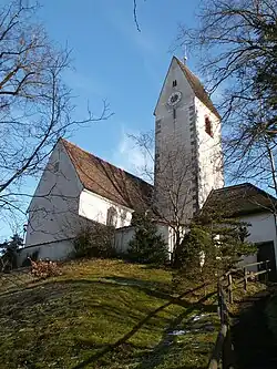 An die schlichte Saalkirche ist an der südlichen Flanke der Kirchturm aus dem 15. Jahrhundert angeschlossen. Dieser enthält zwei Glocken von 1836. Das romanische Langhaus wurde 1063 errichtet. Der Eingang befindet sich an der Südseite, bei Renovierungsarbeiten wurde direkt gegenüber eine zugemauerte zweite Tür gefunden. Der mündlichen Überlieferung zufolge gab es einst zwei adelige Brüder, die jedoch verfeindet waren und daher nicht den gleichen Eingang nutzen wollten.[1][5]