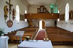 Der Innenraum des Langhauses ist mit einer Flachdecke überspannt, der des Chors, d. h. das Erdgeschoss des Chorturms, mit einem Kreuzrippengewölbe auf Konsolen. Der Hochaltar wurde um 1730 gebaut. Sein Altarretabel wird von den Statuen des heiligen Franz Xaver, des Johannes Nepomuk, des heiligen Rochus und des heiligen Wendelin flankiert. An der Südwand befindet sich eine Kreuzigungsgruppe aus dem 18. Jahrhundert. Die einmanualige Orgel auf der Empore wurde von Joseph Bittner gebaut.
