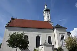 Die Kirche ist einschiffig. Der Stuckdekor der Kirche ist ein Werk des Wessobrunner Baumeisters Joseph Schmuzer. Das Langhaus besitzt eine zentrale Flachkuppel mit Fresken des Dillinger Malers Anton Wenzeslaus Haffe, auf den auch die anderen Fresken der Kirche wie die der Kuppel des Chores zurückgehen. Aus der Nachkriegszeit stammt das Hochaltargemälde. Es wurde von Franz Klemmer, einem Schüler von Hugo von Habermann, geschaffen.