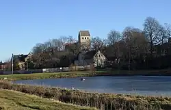 Der Zugang vom Dorf zum Kirchhof erfolgt durch einen Torbogen. Die Mauer des Kirchhofes enthält mehrere Grabsteine aus dem Zeitraum von der Mitte des 16. bis zum Anfang des 17. Jahrhunderts. Bemerkenswert sind die fast in Lebensgröße gestalteten Reliefs betender Menschen. Mehrere der Grabsteine wurden für Mitglieder der Familie von Berndes gesetzt.