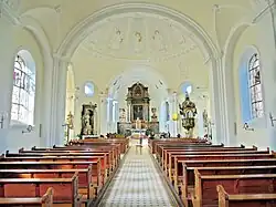 Die bei Restaurierungsarbeiten nach 1945 vorgenommene Ausmalung ist ein Werk des Kunstmalers Feltes (Saarlouis). Die Reliefs an der Kuppeldecke stammen von Corbinian Hasslinger (Gersweiler, verstorben 1954)[10].