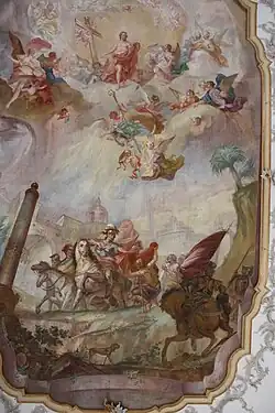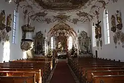 Die Deckengemälde wurden 1762 von Johann Baptist Enderle geschaffen. Im Chor ist eine Rosenkranzmadonna mit dem hl. Dominikus und der hl. Katharina von Siena dargestellt. Diese sind vor einer Scheinarchitektur abgebildet. Die Darstellung der vier Evangelisten in den Eckfeldern ist modern. Im Rahmen des Chores befindet sich in zwei Rocaillekartuschen das Wappen des Abtes Anselm Erb aus dem Kloster Ottobeuren, sowie ein Chronostichon. Das Deckengemälde im Langhaus zeigt Christus in der Glorie und die Mantelteilung des hl. Martin. Das Deckengemälde ist bezeichnet mit Joh. Bap. Enderle pinxit. Weitere Darstellungen aus der Legende des hl. Martin befinden sich in den vier Feldern an den Seiten des Hauptbildes. Die Felder sind in gelber Tonmalerei gestaltet.