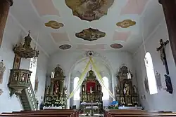 Der Stuck und die Fresken sind von 1922. Die Kreuzwegstationen wurden 1780 von F. Stiber (auf der 13. Station bezeichnet) geschaffen. Die Altäre und die Kanzel entstanden um 1897. Im linken Seitenaltar befindet sich eine Muttergottesfigur von 1483.