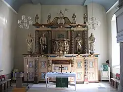 Zur Kirchenausstattung gehören ein barocker Kanzelaltar und eine 1801 gebaute Orgel mit 15 Registern.
