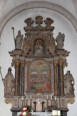 - Ein Hochaltar von 1677 aus Marmor und Alabaster, mit einem Abendmahlrelief und verschiedenen Figuren