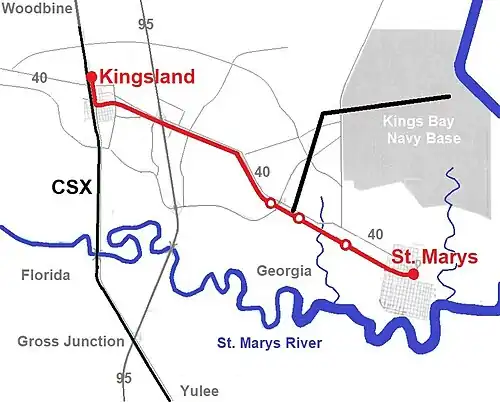 ![]() Die Strecke der St. Marys Railroad | |||||||||||||||||||||||||||||||||||||||||||||||||||||||||||||||||||||||||||||