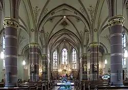 Neben der ornamentalen Wand- und Deckenmalerei aus der Erbauungszeit, hat sich nahezu die komplette neugotische Ausstattung der Kirche erhalten. Davon zu erwähnen sind der reich geschnitzte hölzerne Hochaltar mit zwei dazugehörigen Seitenaltären in den Seitenschiffen, das kleine Chorgestühl im Chorraum, das steinerne Taufbecken, sowie der reliefartige Kreuzweg und die Beichtstühle.