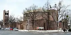 Eine geschlossene Anlage umfasst die Kirche und die zugehörigen Bauten; sie sind einheitlich sowohl außen als auch innen in bräunlichem Backstein ausgeführt. Das Zentrum, von dem aus alle Bauten zugänglich sind, bildet der mit einer Backsteinmauer gegen die Straße abgegrenzte Kirchhof, gepflastert mit rötlichem Backstein. Der Zugang zum Hof liegt im zwanzig Meter hohen Campanile. Der eigentliche – fensterlose – Kirchenbau im Osten der Anlage steht auf quadratischem Grundriss. Eine in den Bau eingestellte 14 Meter hohe Rotunde ragt zur Hälfte aus den Außenmauern empor und bildet damit eine bereits von weitem sichtbare Dominante. Der Eingang zur Kirche ist durch einen an die Rotunde angelehnten turmartigen Quader gleicher Höhe betont; ein gleichartiger Anbau befindet sich auf der gegenüberliegenden Seite.