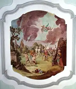 Die Freskenausmalung erfolgte 1779. Bei ihrer Freilegung 1939 wurden sie überarbeitet. Dargestellt sind Szenen aus dem Leben des Kirchenpatrons, die Trinität und verschiedene Embleme.[6]