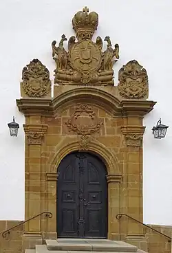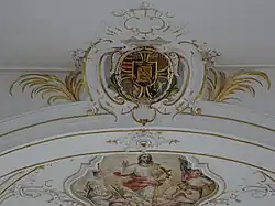 Die Kirche wurde 1780 nach einem Entwurf von Johann Michael Keller dem Jüngeren für den Deutschen Orden errichtet. Die Kerzenhalter an der Kirchenwand zeigen das schwarze Kreuz des Deutschen Ordens. Das Hauptportal zeigt das Wappen des Hochmeisters Karl Alexander von Lothringen, das von Adlern flankiert wird, darunter sind Kanonen, Trompeten und Kanonenkugeln dargestellt. Das Wappen links vom Hochmeisterwappen ist jenes des Landkomturs Franz von Lehrbach. Die beiden bisher genannten Wappen finden sich auch an der St.-Augustinus-Kirche in Stopfenheim. Rechts des Hochmeisterwappens findet sich das Wappen von Rudolf von Werdenstein, der Komtur auf der Kapfenburg war, die wenige Kilometer von Westhausen entfernt liegt.[1]