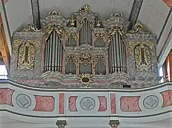 Die große Saalkirche wurde 1736–39 unter Einbeziehung eines in Teilen mittelalterlichen Turms im Osten erbaut. Der Kirchturm ist mit einer Haube bedeckt, auf der eine Laterne sitzt, die mit einer Wetterfahne mit der Bezeichnung 1739 bekrönt ist. In ihm hängt eine Glocke, die 1522 gegossen wurde. Der Turm hat klobige Strebemauern. Die Längswände des Kirchenschiffs mit fünf Achsen sind durch Lisenen gegliedert, dazwischen sind korbbogige Fenster. In der Mitte sind die Portale mit Verdachungen. Unterhalb der Dachtraufe befindet sich ein verkröpftes Gesims. Sämtliche Elemente der Gliederung sind in Werkstein ausgeführt. Das Kirchenschiff ist außen mit einem Walmdach bedeckt, innen mit einer teilweise gewölbten Holzbalkendecke. Der Innenraum hat dreiseitige, zweigeschossige Emporen. Im Osten sind zweigeschossige Logen. Die Kirchenausstattung ist aus der Erbauungszeit. Vor der Ostwand der Kirchenschiffes steht ein kleinteilig dekorierter, mehrfarbig marmorierter Kanzelaltar mit Kruzifix, Engeln und Putten. Er ist mit 1744 bezeichnet. Auf dem geschnitzten barocken Taufbecken sitzt ein Pult. Die Orgel mit 24 Registern, verteilt auf 2 Manuale und Pedal, wurde um 1820 von einem unbekannten Orgelbauer gebaut.[2] 1897 und 1934 wurden Baumaßnahmen durchgeführt. Das Innere wurde in den 1970er Jahren renoviert. 1997 bekam die Kirche eine neue Schieferdeckung.