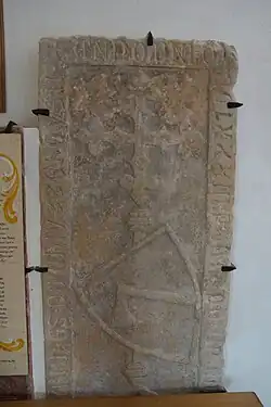 Eine Besonderheit der Kirche ist die sog. Stabkreuzplatte von Allersburg. Sie ist ein Epitaph für den am 29. September 1283 verstorbenen Ritter Heinrich von Kutzenhofen. Die Steinplatte ist innen neben dem Haupteingang an der Südseite der Kirche stehend eingemauert. Sie ist 1,86 m hoch und 0,78 m breit. Ursprünglich war sie in das Kirchenpflaster eingelassen und deckte die Grabstelle. Bei der Renovierung 1985 wurde sie aufgestellt, um sie vor weiterer Abnutzung zu schützen. Eine Stabkreuzplatte zeigt in der Regel ein Hochkreuz, dessen Fuß auf einem Dreiberg (auch Dreipass genannt) steht. Hauptelement ist ein griechisches Kreuz, welches sich nach unten in einer Stange fortsetzt. Vielfach ist auch ein linksgeneigter Schild des Verstorbenen aufgelegt. Im vorliegenden Fall zeigt der Grabstein ein erhabenes Kreuz im Flachrelief, dessen mit Nasen besetzte Balken sich an den Enden kleeblattförmig verbreitern. Der Sockel hat die Form eines gedrückten Dreibergs mit innenliegenden Blattmotiven. Der die Breite des Bildfeldes einnehmende Schild zeigt ein Beil, das Wappen der Kutzenhofer. Die Umschrift in gotischen Majuskeln lautet: