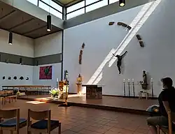 Die Altarinsel ist auf drei Seiten von Sitzgelegenheiten für die Gottesdienstbesucher umgeben, anfangs Kirchenbänke und seit der Umgestaltung 2004 Stühle in halbkreisförmiger Anordnung. Der Innenraum des Stahlbetonskelettbaus wurde mit Sichtmauerwerk aus Kalksandsteinen ausgefacht, die Wandverkleidung des Außenraums besteht aus großflächigen Kalksteinplatten. Die Unterzüge des Flachdachs sind innen sichtbar. Die Altarinsel wird von Obergaden erhellt. Fenster befinden sich ferner an den Wänden, die in Richtung des Portals zeigen. Außerdem sind die Wände zum Teil mit Fenstern aus Glasbausteinen versehen. Eine der Achsen wird von der Empore überbrückt.