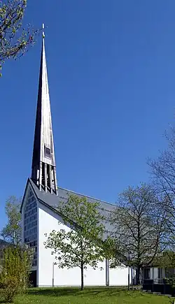 Der schlichte, moderne Bau in Zeltform von Architekt Fritz Strunz aus Bad Tölz ist nach Ostnordosten ausgerichtet. An ihn schließt sich südlich der Pfarrhof an. Der kupferbeschlagene Dachreiterturm im Westen ist 43 Meter hoch, der Dachfirst misst 16 Meter. Die Westfassade wird dominiert von einem großen Buntglasfenster, das der Münchner Glasmaler Hollman schuf. Darüber hinaus besitzt die Kirche nur wenige Fensterschlitze.[2]