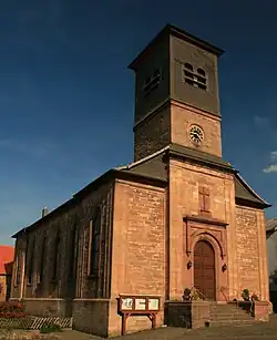 Die dreischiffige klassizistische Hallenkirche wurde 1852 von Baumeister Breithaupt aus Quadermauerwerk errichtet. Die Fassade im Südwesten besteht aus dem Dachturm, in dessen Glockenstuhl fünf Kirchenglocken mit den Tönen g1, b1, c2, es2 und g2 hängen, und seitlichen Nebenräumen. Der Chor im Nordosten ist mit seinen Nebenräumen nur wenig schmaler als das Langhaus. Beide sind mit einem gemeinsamen Satteldach bedeckt.