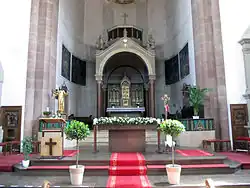 Bemerkenswert im Inneren ist der Baldachin-Altar. Gestiftet wurde er 1898 von Prinz Leopold von Bayern aus München, der damals 20.000 Mark spendete. Entworfen wurde der Altar vom Bildhauer Georg Busch (München).[6] Die Ausführung im deutsch-romanischen Stil erfolgte durch die Herzoglich Bayrische Hof-Kunst-Anstalt Jacob Leser (Straubing).[5] Der auf vier Säulen getragene Überbau sieht aus wie ein Baldachin, der über den Altar gespannt ist, und so dem Altar seinen Namen gibt. In dem frontalen Rundbogen dieses Überbaus steht in lateinischer Sprache geschrieben: „ECCE TABERNACVLVM DEI CVM HOMINIBVS“. (deutsch: „Seht das Zelt Gottes unter den Menschen.“)[6]