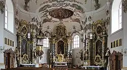 Auf dem Fresko an der Decke des Langhauses ist der Erzengel Michael dargestellt. Die Deckenmalerei am Spiegelgewölbe im Chor zeigt die heilige Dreifaltigkeit. Zur Kirchenausstattung gehört ein in der Mitte des 18. Jahrhunderts gebauter Hochaltar, der von je drei Säulen flankiert wird, die einen Baldachin tragen. Auf dem Altarretabel ist der Erzengel Michael dargestellt. Im Altarauszug ist Maria zu sehen.