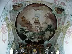 Die meisten der zahlreichen Fresken schuf Franz Martin Kuen in den Jahren 1752 und 1753. Das größte Fresko nimmt fast die gesamte Deckenfläche des Hauptschiffes ein. Es zeigt die Auflehnung des Teufels gegen Gottes Heilsplan der Erlösung der Menschheit durch Jesus. Der Kirchenpatron, der heilige Michael, ist besonders hervorgehoben und befindet sich im Engelsturz. Über der Szene ist eine Immaculata von Engeln umringt. Auf sie zu schwebt das Jesuskind in einer Kugel. Auf Jesus trifft ein Lichtstrahl aus einer Glorie mit der Heiligen Dreifaltigkeit als Zeichen des Heiligen Geistes. In den Ecken des Langhauses sind die vier abendländischen Kirchenväter dargestellt, in der südöstlichen Ecke Hieronymus, in der nordöstlichen Augustinus, in der nordwestlichen Ambrosius von Mailand und in der südwestlichen Gregor der Große. Zwei Kartuschen an der Decke in der Mitte des Langhauses zeigen die Dominikanerheiligen Dominikus und Katharina von Siena. An den Wänden des Hauptschiffs befindet sich ein fünfzehnteiliger Kreuzweg in Freskomalerei mit Stuckeinfassung. Die 15. Station ist in der Mitte der unteren Emporenbrüstung angebracht. Die Musikpatronin, die heilige Cäcilia, ist in der Mitte der oberen Empore, auf der sich auch die Orgel befindet, zu sehen.
