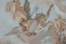 Die Fresken wurden im gleichen Jahr von Johann Anwander aus Lauingen ausgeführt. Auf dem Chorfresko wird der Triumph der katholischen Eucharistielehre über die Lehren der Reformation versinnbildlicht. Ein offenes Buch auf einem Altar wird von den Evangelistensymbolen Löwe, geflügelter Mensch, Stier und Adler umgeben, darüber schweben ein Kelch und eine Monstranz. Am Obelisk befindet sich ein Porträt des Augsburger Fürstbischofs Johann Christoph von Freyberg. Daneben kniet ein Papst. Zwei weibliche Figuren, eine hält ein Bild mit der Unterschrift Seelen Ablas in der Hand, verweisen auf die Erlösung vom Fegefeuer durch den Ablass. Am unteren Bildrand sieht man links eine Weltkugel mit den personifizierten Darstellungen der vier Erdteile. Rechts daneben stürzen Häretiker in den Abgrund. Die vier Grisaillen symbolisieren die theologischen Tugenden Glaube, Hoffnung, Liebe und die Ecclesia, die Kirche.