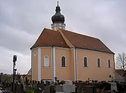 Die Saalkirche wurde um 1718 errichtet. Sie besteht aus einem Langhaus, einem eingezogenen, dreiseitig geschlossenen Chor im Osten und einem Kirchturm an der Südwand des Langhauses. Seine beiden unteren Geschosse stammen aus der Zeit der Gotik, das obere beherbergt die Turmuhr. Um 1843 wurde der Kirchturm mit einem achteckigen Geschoss aufgestockt, das den Glockenstuhl beherbergt, in dem fünf Kirchenglocken hängen, und mit einer Zwiebelhaube bedeckt ist. Zur Kirchenausstattung gehört ein Hochaltar mit einer Darstellung des Erzengels Michael als Drachentöter aus der Erbauungszeit. Die Kanzel hat Christoph Luybl geschaffen.