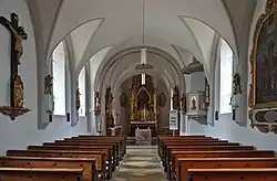 Nach Abschluss der 2020 begonnenen Renovierung und Umgestaltung des Innenraums weihte Weihbischof Rupert Graf zu Stolberg am 27. Oktober 2024 den neuen Zelebrationsaltar und segnete den Ambo. Den aus rotem Adneter Marmor in kubischer Form gestalten Altar wie auch den ebenfalls aus Marmor gefertigten Ambo mit einer Buchauflage aus Messing schuf der Bildhauer Anton Stegmayer aus Kiefersfelden. Der Sitz des Priesters und die weiteren Sitzgelegenheiten des liturgischen Dienstes bestehen aus feinen Messingstäben.[2] Die zweimanualige Brüstungsorgel wurde 1963 von Anton Staller gefertigt.