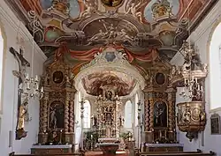 Die Deckenmalereien werden Johann Adam Schöpf und seinem Sohn Johann Nepomuk Schöpf zugeschrieben. Im Langhaus ist der Höllensturz der gefallenen Engel dargestellt. Das Bild im Chorgewölbe zeigt in der Mitte Gottvater auf einer Wolke thronend, umgeben von vielen Engeln. Die rechte Hand hebt er zum Segen empor und in der linken hält er ein Zepter. Am unteren Bildrand wird ein Vorhang emporgeschoben, über dem die Bundeslade steht, die nach Anweisung Gottes hergestellt war, um unter anderem die Tafeln mit den Zehn Geboten aufzunehmen. Im Jahr 2010 wurden die Deckengemälde restauriert.
