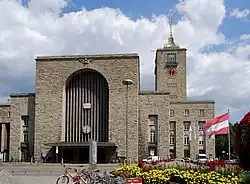 Empfangsgebäude des Hauptbahnhofes Stuttgart: Steinverkleidung, Rundbogennische, Maßwerkstäbe und Turmgestaltung weisen deutliche architektonische Verwandtschaftsbezüge zur St. Johanner Michaelskirche auf.