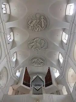 Das Deckengewölbe des Langhauses trägt drei ovale Bildmedaillons von 4,2 × 5,2 m Größe. Sie zeigen von hinten nach vorn