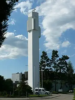 In der Nähe des Spitals Zollikerberg und der Station Zollikerberg der Forchbahn gelegen, befindet sich die Kirche St. Michael auf abfallendem Gelände an der Ecke Neuweg und Wilhofstrasse. Der 32 Meter hohe, fünfeckige Betonturm zeigt dank seiner Höhe von weitem, wo sich die Kirche befindet. Sein Glockenstuhl wurde mit kubischen Formen derart gestaltet, sodass er aus einigen Blickwinkeln an eine Hand erinnert. Bekrönt wird der Turm durch ein 2,90 Meter hohes und 1,50 Meter breites Kreuz.[10] Im Kirchturm befinden sich fünf Bronzeglocken, die auf das Geläut der reformierten Kirche Zollikerberg abgestimmt sind. Sie wurden von der Glockengiesserei Rüetschi, Aarau hergestellt, an Christi Himmelfahrt geweiht und am 19. und 20. Mai 1966 durch die Schuljugend in den Turm aufgezogen.[11] Die fünf Glocken besitzen folgende Daten[12] und Inschriften:[13]