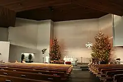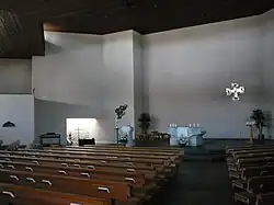 Die Kirche ist als Querbau gestaltet und versammelt die Gottesgemeinde auf Kirchenbänken in einem Halbkreis um die Altarinsel. Auf den Bänken finden bis zu 500 Personen Platz. Die Anordnung der Kirchenbänke verweist auf den Communio-Gedanken des Zweiten Vatikanischen Konzils, welcher die Gemeinschaft von Gläubigen und Seelsorger betont hatte. Der mit dunklen Steinplatten aus Genueser Schiefer belegte Boden fällt leicht zum Altarraum hin ab und ermöglicht so auch den weiter hinten Sitzenden eine gute Sicht auf den Altarraum. Die 800 m² grosse Decke der Kirche ist mit amerikanischem Redwood-Holz verkleidet und enthält Leuchten, die in ihrer Anordnung an einen Sternenhimmel erinnern. Eine Fensterfront im gestaffelten Kirchendach mit blau getöntem Antikglas nach einem Konzept von Max Rüedi lässt das Tageslicht dezent in den Kirchenraum einfallen.[16] Weil die Kirche als «Abendmahlssaal» konzipiert wurde, ist sie bewusst in schlichter Einfachheit gehalten. Als Zentrum erkennbar ist der weisse Altar, hinter dem die Altarwand mit ihrer grossen und ruhigen Wandfläche auf diesen verweist.[17]
