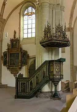 Die Kanzel, die kurz nach 1600 entstand, ist besonders reich dekoriert; dies zeigt, dass der Predigt im lutherischen Gottesdienst eine besondere Bedeutung zukommt. Außer Bildern sind auch Schriften in deutscher Sprache an der Kanzel angebracht. Die beiden ineinander verschlungenen griechischen Buchstaben X (Chi) und P (Rho) an der Tür sind die Anfangsbuchstaben des griechischen Wortes ΧPHΣTOΣ (Christus). Der ebenfalls reich dekorierte Kanzeldeckel mit der Taube, die den Heiligen Geist symbolisch darstellt, stammt etwa aus dem Jahr 1630. In den Figurennischen stehen die fünf Kardinaltugenden. Am Geländer der Treppe steht: „Das Evangelium von Christo ist eine Kraft Gottes, die da selig machet alle, die daran glauben.“ Darunter sind die vier Evangelisten abgebildet: Matthäus mt dem Engel, Markus mit dem Löwen, Lukas mit dem Stier und Johannes mit dem Adler. An der Kanzel selbst steht in niederdeutscher Sprache ein Text aus dem Römerbrief: DE GELOVE KVMBT // VON DER PREDIGT // DAT PREDIGEN ABER IST // DORCH DAS WORT GODES.