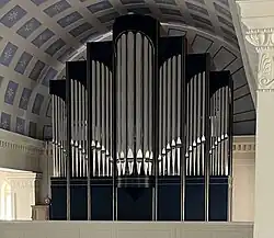 Die mit Nachkriegsmaterial gebaute Schuster-Orgel konnte aufgrund klanglicher Mängel nur bis 2010 im Gottesdienst genutzt werden und wurde 2017 ganz stillgelegt.[4] Brauchbare Register wurden in einen Neubau übernommen.[5] Die Firma Ekkehart Groß (Kubschütz) errichtete die neue, 2500 Pfeifen enthaltende Orgel, wegen deren Gewicht von 7,5 Tonnen die Empore zunächst stabilisiert wurde.[4][6] Die Architektin Sina Stiebler lieferte den Entwurf.[4] Das neue Instrument wurde am 15. Juni 2025 eingeweiht. Als Besonderheit verfügt es über einen zusätzlichen Spieltisch, der fahrbar im Kirchenraum positioniert werden kann.[7]